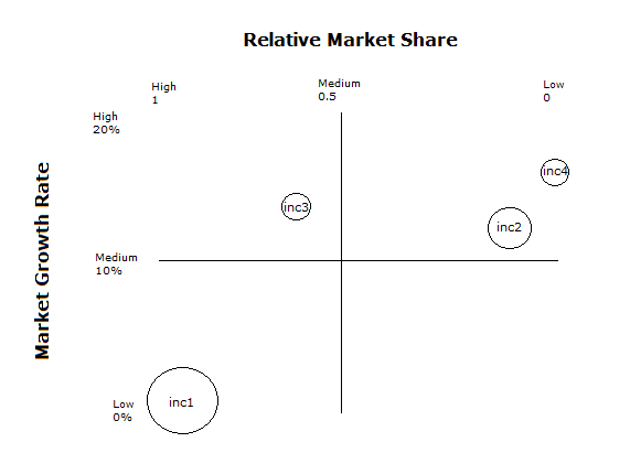 เพียงเท่านี้เราก็จะสามารถนำข้อมูลทั้งหมดที่มีมาใช้วิเคราะห์ได้ว่าสินค้าแต่ละชนิดนั้นอยู่ในตำแหน่งใด และควรมีการดำเนินแผนการตลาดอย่างไรบ้าง อย่างเช่นตามในรูปนั้นก็จะเห็นได้ว่าสินค้า inc1 นั้นอยู่ในส่วนของ Cash Cows ที่ถือว่ามีส่วนแบ่งทางการตลาดมากในตลาดที่ไม่เติบโตแล้ว ก็จะทำให้เราวิเคราะห์ได้ว่าเราสามารถนำเงินที่ลงทุนกับธุรกิจ inc1 ที่มีสภาพคงที่แล้วนั้น ไปช่วยลงทุนทางการตลาดเพิ่มสำหรับสินค้าชนิด inc2, inc3 และ inc4 เพื่อเพิ่มส่วนแบ่งการตลาดในขณะที่ตลาดอยู่ในขาขึ้นได้ เพื่อให้สินค้า inc2 และ inc4 ขยับจากตำแหน่ง Question Marks ไปอยู่ที่ Stars และให้สินค้า inc3 นั้นเปลี่ยนจาก Stars ไปสู่ Cash Cows เมื่อตลาดอยู่ตัวแล้วเช่นเดียวกับสินค้า inc1