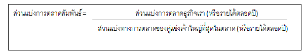 ในทฤษฎีของ BCG Matrix นั้น ส่วนแบ่งการตลาดเชิงสัมพันธ์ หรือ Relative Market Share สามารถคำนวณได้จากการนำส่วนแบ่งการตลาดทั้งหมดของเรา (หรือรายได้ของธุรกิจ) ไปหารกับส่วนแบ่งทางการตลาดของคู่แข่งเจ้าที่ใหญ่ที่สุดในตลาด (หรือรายได้ของธุรกิจ) ตัวอย่างเช่น ถ้าธุรกิจของคู่แข่งเจ้าที่ใหญ่ที่สุดของตลาดมีส่วนแบ่งทางการตลาดอยู่ที่ 25% แต่ในส่วนของธุรกิจของเรานั้นมีส่วนแบ่งการตลาดอยู่ 10% ในปีเดียวกัน ดังนั้นเมื่อคำนวณแล้วก็จะพบว่าธุรกิจของเรานั้นมีส่วนแบ่งการตลาดสัมพันธ์ค่า 0.4 ซึ่งค่าส่วนแบ่งการตลาดสัมพันธ์จะใช้บนแกน X ใน BCG Matrix โดยจะแบ่งให้ฝั่งซ้ายสุดมีค่าตลาดสัมพันธ์ 1.0 ตรงกลาง 0.5 และด้านขวาสุดเป็น 0 (ดูภาพประกอบได้ในหัวข้อตัวอย่างการทำ BCG Matrix)