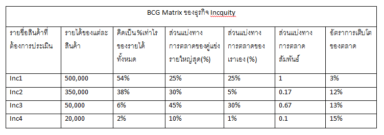 กำหนดให้บริษัท Incquity นั้นมีสินค้าออกสู่ตลาดมากมาย ซึ่งสินค้าแต่ละอย่างก็มีลักษณะแตกต่างกันออกไปทำให้ต้องจำแนกให้อยู่คนละตลาด โดยในช่วงสิ้นปีนั้นบริษัท Incquity ต้องการที่จะประเมินสินค้าแต่ละชนิดส่าอยู่ในตำแหน่งใดในธุรกิจบ้าง เพื่อนำมาวิเคราะห์ดูว่าในปีต่อไปจะต้องวางแผนการตลาดของสินค้าแต่ละชิ้นได้อย่างไรบ้าง ซึ่งหลังจากรวบรวมข้อมูลมาได้แล้วก็จัดเรียงตามในตารางดังนี้